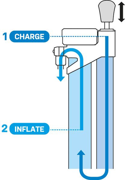 Hustilka má integrovanú duralovú vzduchovú komoru (zásobník) s objemom na 1 liter vzduchu do maximálneho tlaku 160 psi / 11 bar, z ktorej pomocou prepínača za okamih natlakujete tubeless plášť s potrebným objemom vzduchu pre jeho dôkladné utesnenie v ráfiku. Následne doladíte na požadovaný tlak hustením v normálnom režime.