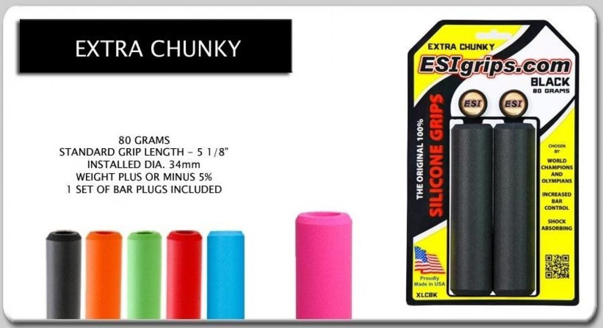 ESI Grips Chunky Extra ESI Grips – Ako prvá firma vyrába špičkové 100% silikónové gripy a omotávky na bicykle už od roku 1999. Vývoj aj výroba priamo v USA. ESI Grips sú v súčasnosti najžiadanejšie a najpoužívanejšie gripy medzi špičkovými pretekármi... Zobraziť viac
